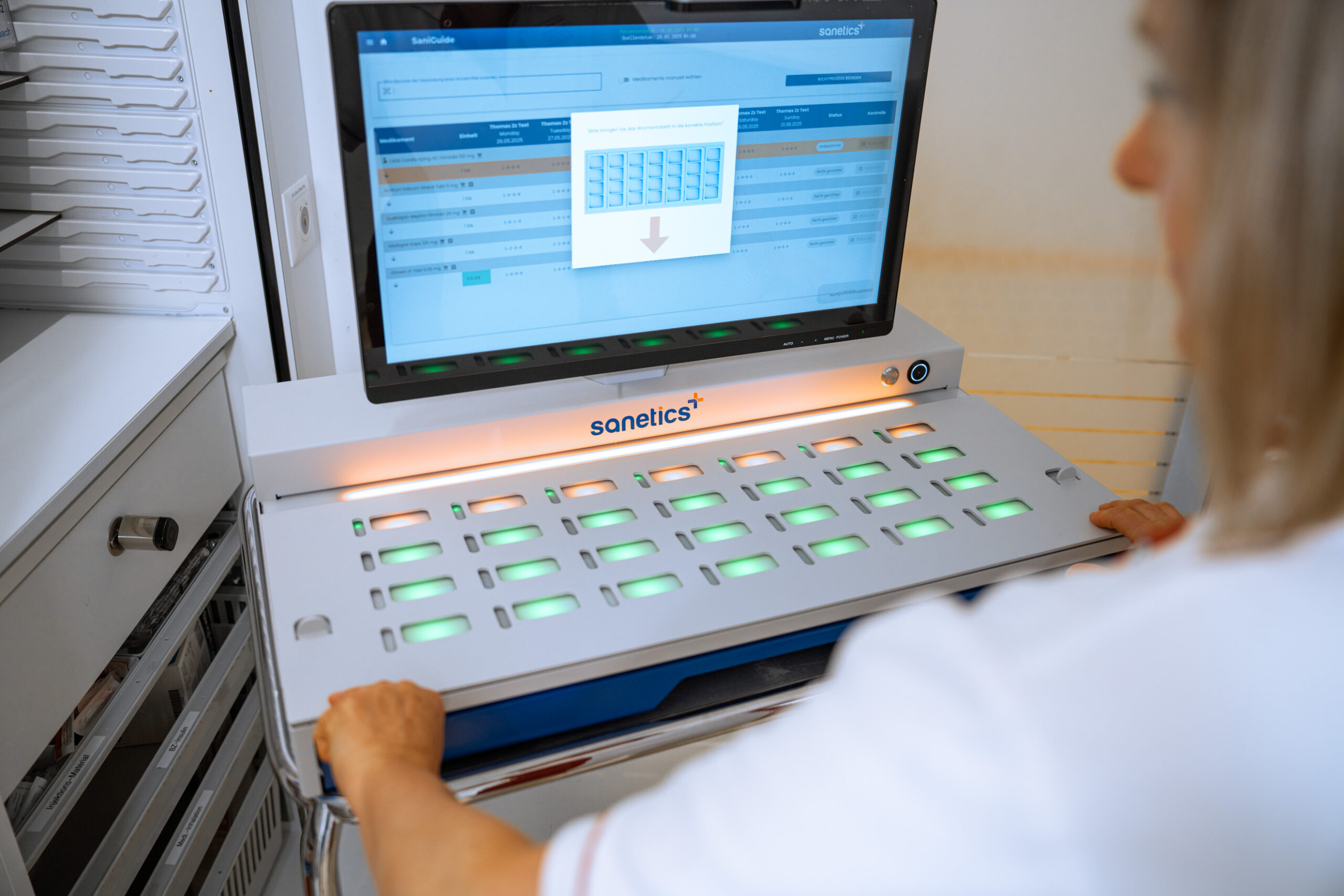 Sanetics SaniGuide ist eine innovative Richtstation, die das Pflegepersonal sicher durch den Befüllungsprozess von Medikamentendispensern führt und eine automatisierte Prüfung vornimmt. Die Lösung gewährleistet höchste Sicherheit und Effizienz, bietet Entlastung für Fachkräfte im Gesundheitswesen und dokumentiert den gesamten Vorgang.